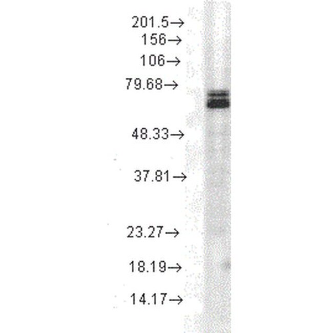 0.2 μg/mL of MA5-45214 was sufficient for detection of HSP70 in 20 μg of heat shocked HeLa cell lysate by colorimetric immunoblot analysis using Goat anti-mouse IgG:HRP as the secondary antibody. Detects approximately 70kDa. May detect HSP70, HSC70, p75 and HSP72.
