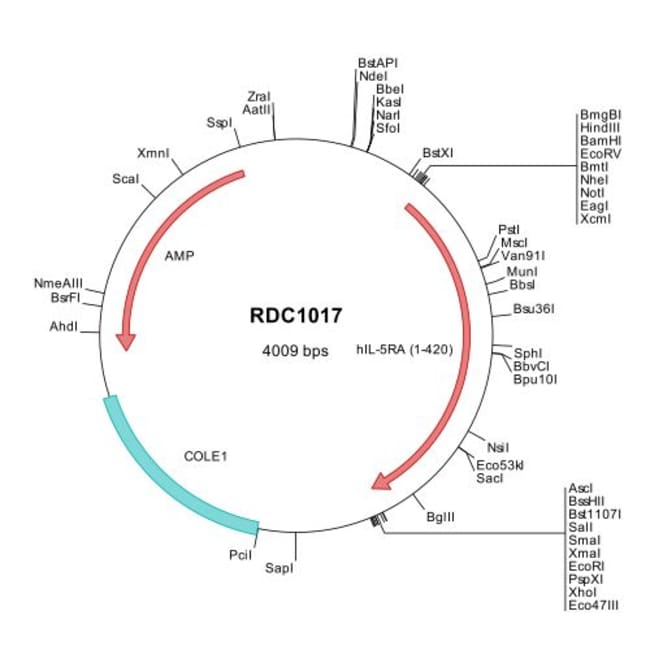 The Human IL-5 R alpha/CD125 (NP_000555) VersaClone cDNA clone contains the complete ORF for IL-5R alpha/CD125, along with a Kozak consensus sequence for optimal translation initiation. The gene insert is flanked with convenient multiple cloning sites which can be used to easily cut and transfer the gene cassette into your desired expression vector. The IL-5R alpha/CD125 insert is sequence verified and the entire plasmid DNA and insert translated sequences are provided.